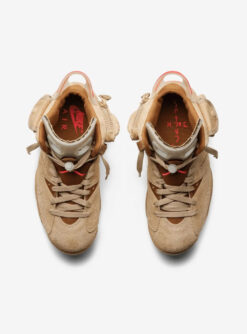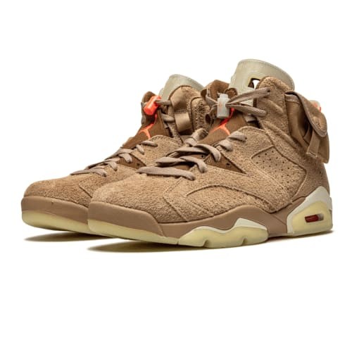 The Travis Scott x Air Jordan 6 Retro ‘British Khaki’ is a standout collaboration that reimagines the classic silhouette with unique design elements. The upper is crafted from premium British Khaki suede, complemented by Sail and Bright Crimson accents. Notable features include dual stash pockets—one with a snap closure and another with a zip—located on the ankle collars, adding both style and functionality. The translucent tongues, heel tabs, and co-branded semi-translucent outsoles enhance the sneaker’s aesthetic depth. Cactus Jack branding is prominently displayed on the heel, lace toggle, and sock-liner, reinforcing the collaborative theme. Released on April 30, 2021, this limited edition sneaker quickly became a sought-after item among sneaker enthusiasts. (goat.com, hypebeast.com, sneakerfreaker.com, sneakerreporter.com)