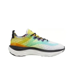 The PUMA Love Marathon ForeverRun Nitro ‘Colorful’ is a vibrant and supportive running shoe designed for overpronators. It features a dual-density NITRO™ foam midsole with a firmer outer rim and softer inner core, providing responsive cushioning and stability. The engineered mesh upper is reinforced with PWRTAPE overlays for targeted support, while the asymmetrical heel counter and wide midsole geometry enhance stability. The PUMAGRIP outsole ensures excellent traction on various surfaces. With a 10mm heel-to-toe drop and a recommended lifespan of 800 km, this shoe is ideal for road running and long-distance training.